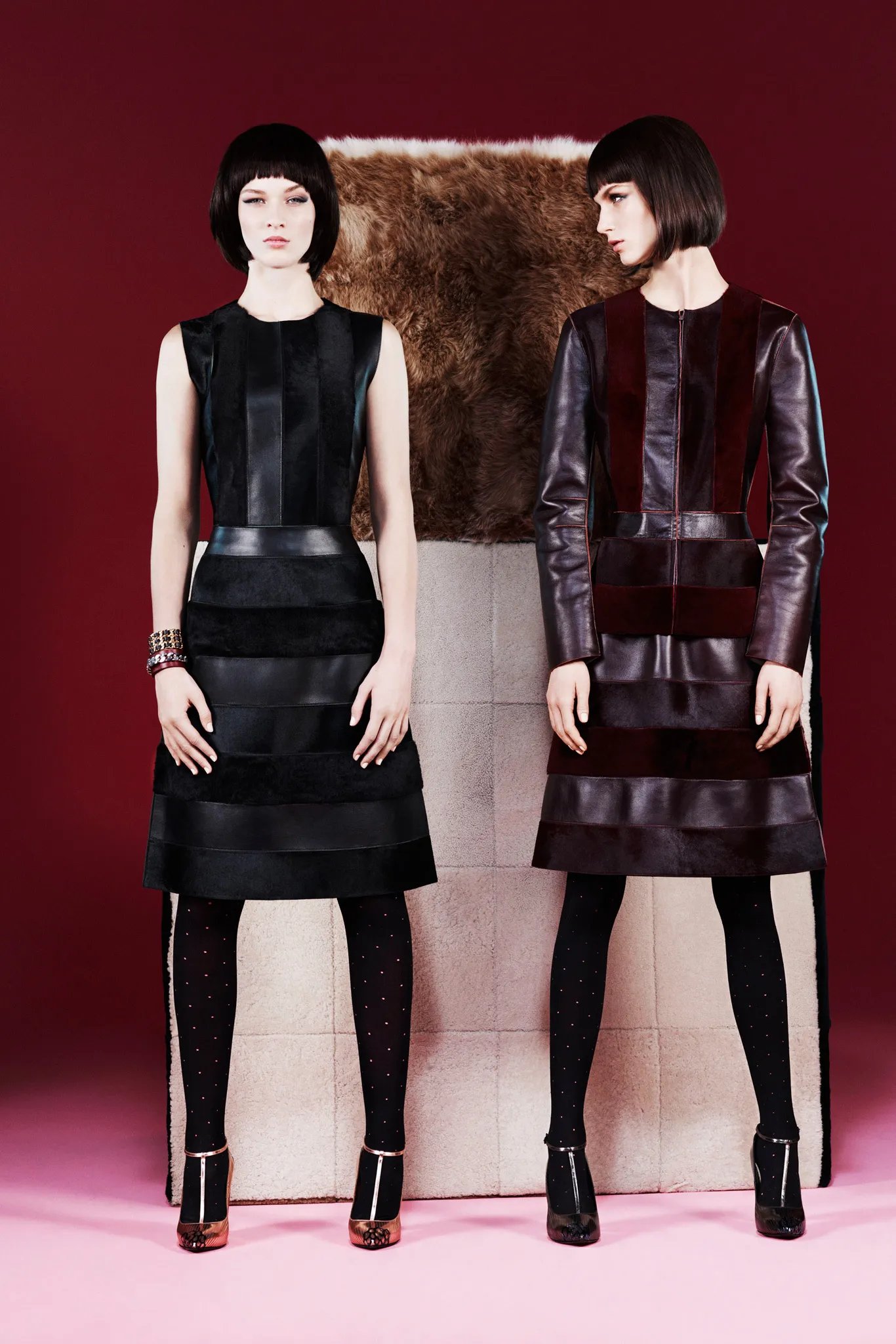 This black leather and suede panel dress from Fendi’s Pre-Fall 2013 collection showcases the house’s extraordinary craftsmanship under co-creative directors Karl Lagerfeld and Silvia Venturini Fendi. Beautifully patchworked, the dress forms subtle stripes that contour the torso. As Vogue observed of the collection, its “astounding workmanship” was evident and it achieved a balance that was “part techy, part craft.”