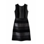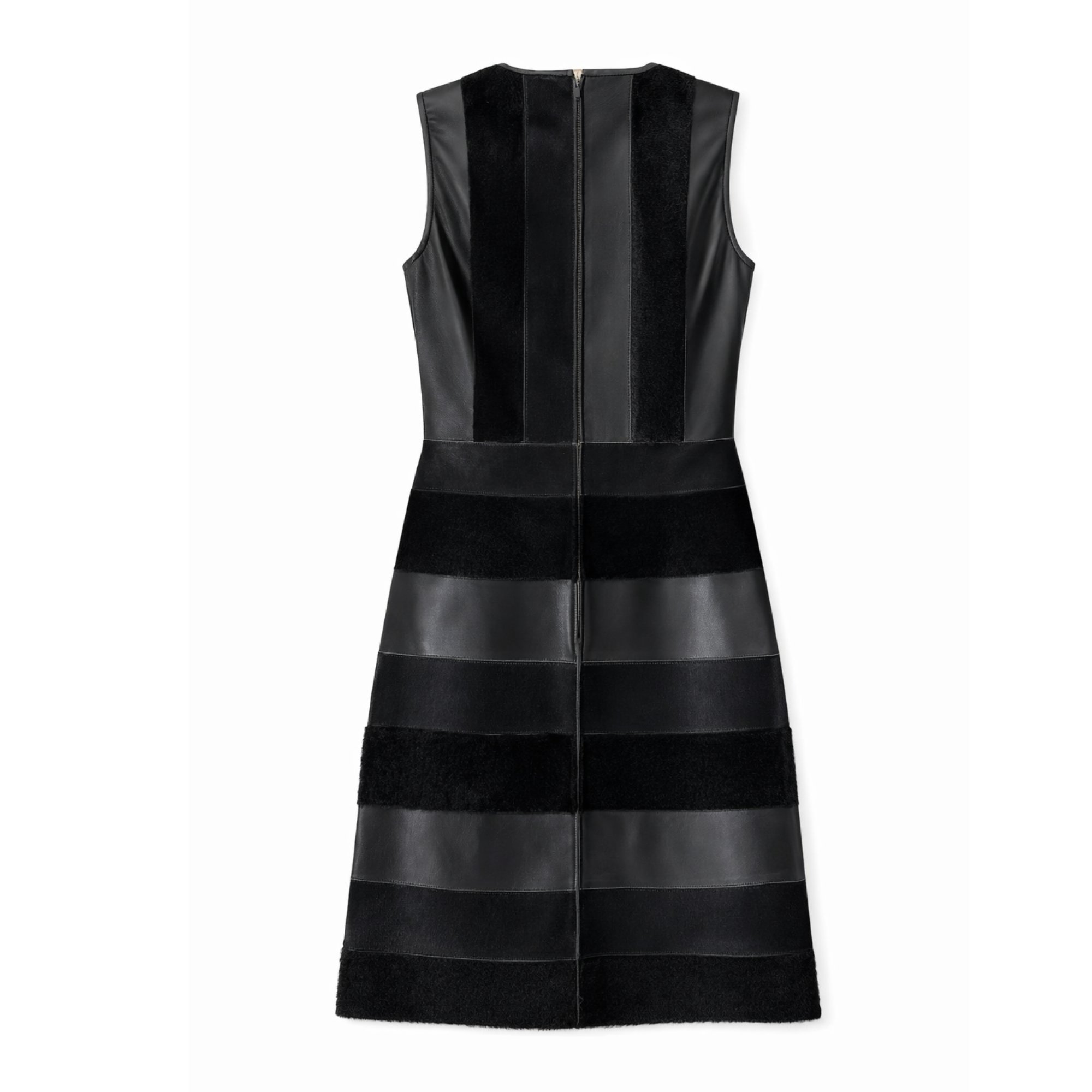 Cut to a shift-dress silhouette, the top is sleeveless with a rounded neckline. It is crafted from vertical panels of ponyskin, leather and sheepskin and trimmed with leather at the neckline and armholes. There is a nipped-in waistband. The skirt falls in an A-line shape that hits just above the knee. It too is composed of panels of these decadent fabrics, this time placed horizontally. The reverse of the leather, and inside of the dress, is a vibrant apple green, which can occasionally be glimsed at the seams. The dress fastens at the back with a hidden tonal zip.